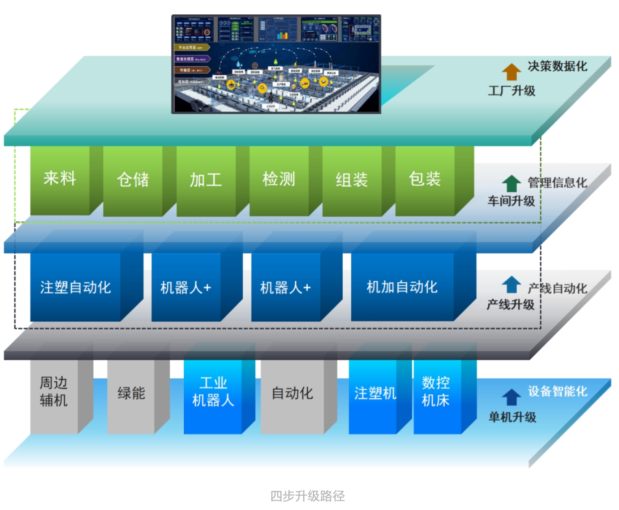 在当前激烈竞争的环境下,企业需要同时降低成本和提高智能化水平。为此,采取以下四个步骤,从装备智能化到产线自动化,再到智能整厂的升级。